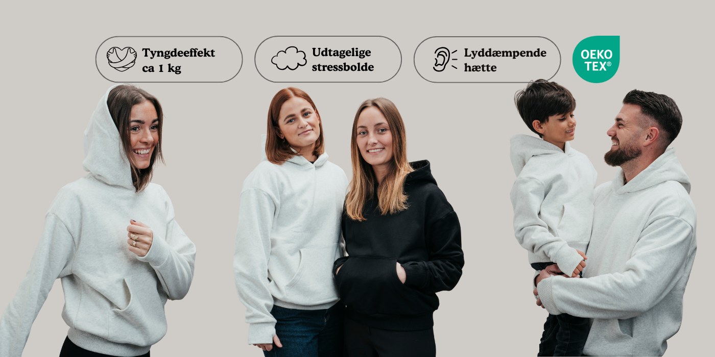 En tyngdehoodie er en hoodie som anvender vægt, designet til at give en følelse af tryghed og komfort. Tyngden fordeles jævnt over kroppen og skaber en sanselig oplevelse, som mange forbinder med ro og nærvær. Flere af vores kunder fortæller, at de oplever mere afslapning og og finder mere ro i hverdagen – særligt i situationer med mange indtryk.
