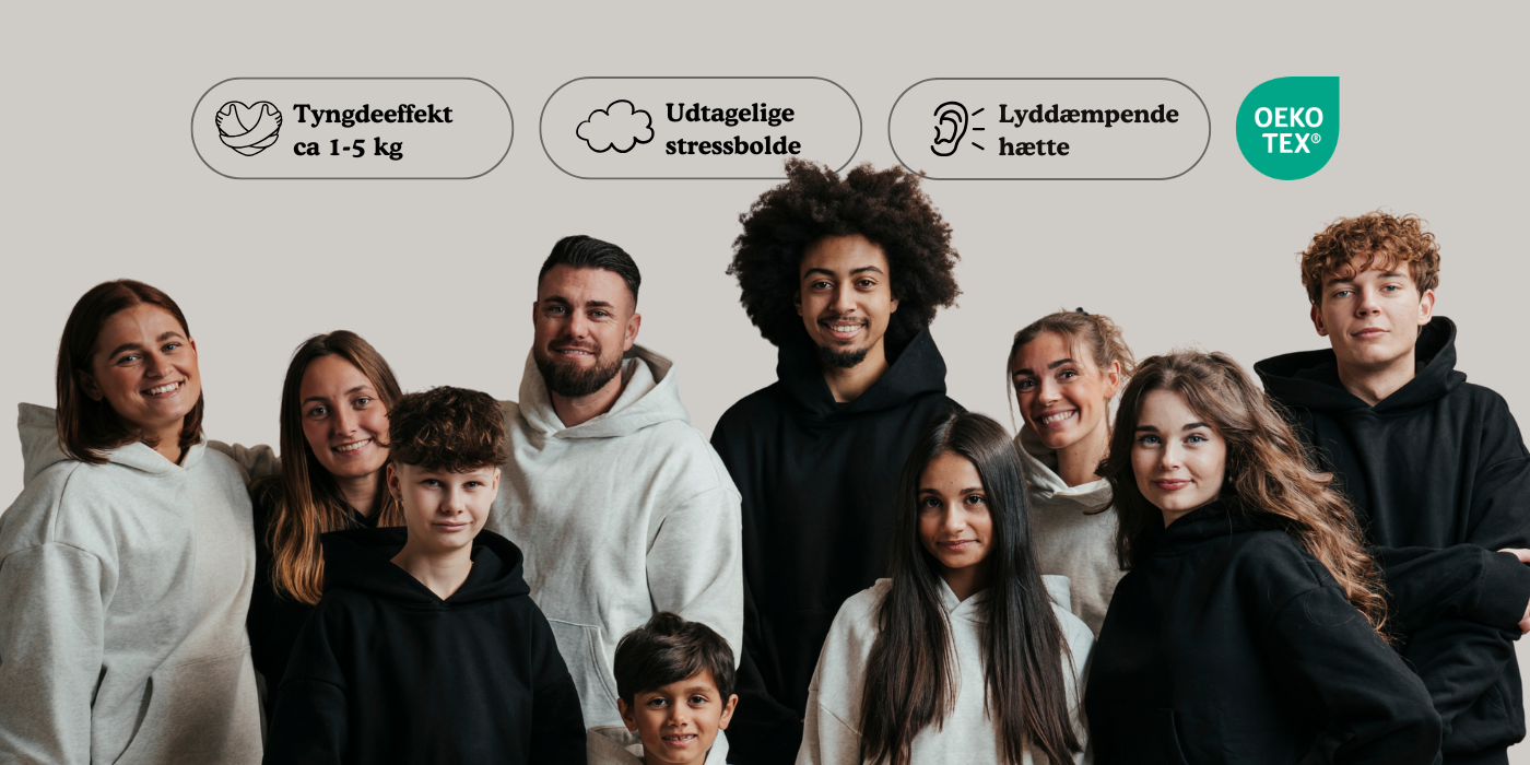 En viktad hoodie är en hoodie som använder vikt, utformad för att ge en känsla av trygghet och komfort. Vikten fördelas jämnt över kroppen och skapar en sensorisk upplevelse som många förknippar med lugn och närvaro. Flera av våra kunder säger att de upplever mer avslappning och finner mer lugn i vardagen – särskilt i situationer med många intryck.